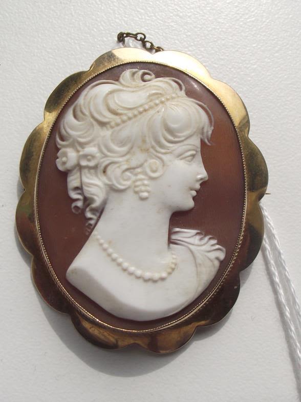 9ct gold cameo brooch with safety chain fully marked 8.2g approx.