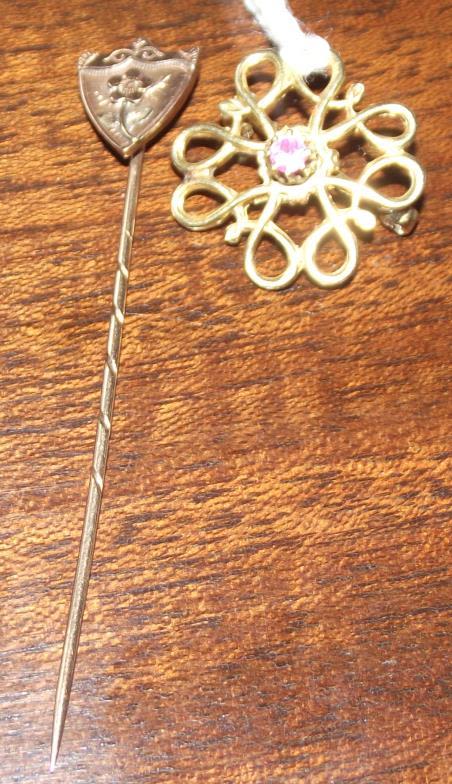 9ct flower head brooch with central red stone + 9ct gold shield stick pin 2.3g approx.