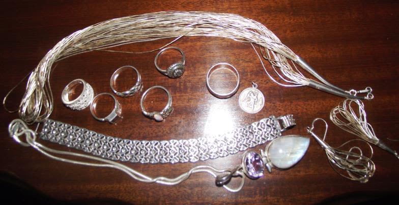 6x silver dress rings + fancy articulated silver bracelet , silver St Christopher , Silverstone set