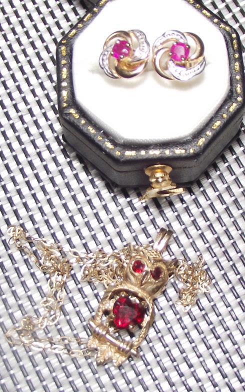 9ct gold owl pendant with red central stone on a 9ct chain + pair of 9ct gold earrings set with red