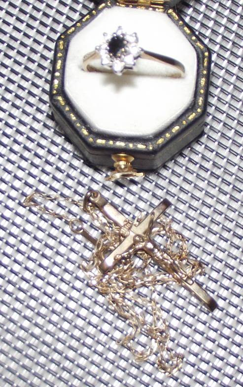 9ct Gold flower head style stone diamond chip 7 sapphire style set ring + 9ct gold cross and chain