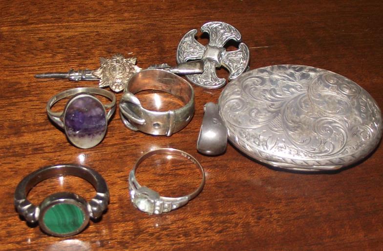 Small parcel of silver items inc locket , blue john ring & other rings, brooch pins etc 42g approx.
