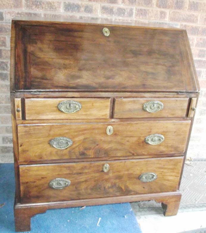 Nice quality mid18thc mahogany fall front bureau with 2 short and 2 long graduated draws , oak linen