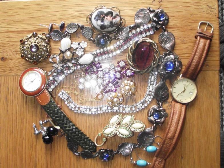 Small collection of assorted costume jewellery + ladies carvel watch & gents quartz Rotary watch