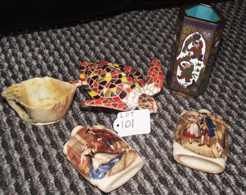 coloured tiles + oriental style inlaid brass metal vase + hand carved soapstone brush wash handle carved as a tree with flowering blossom ( minor chips to rim )