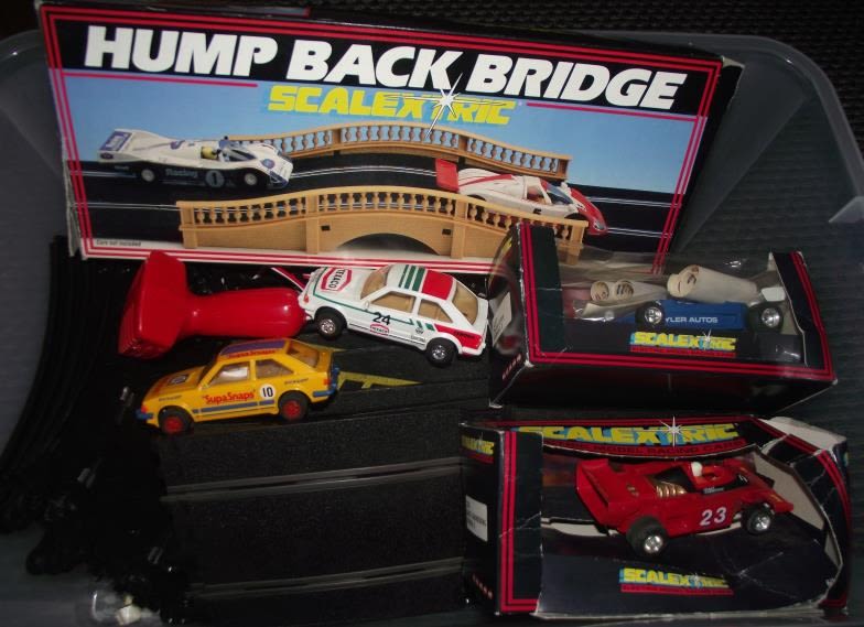 Box of Scalextric inc track bridge , cars , handsets etc