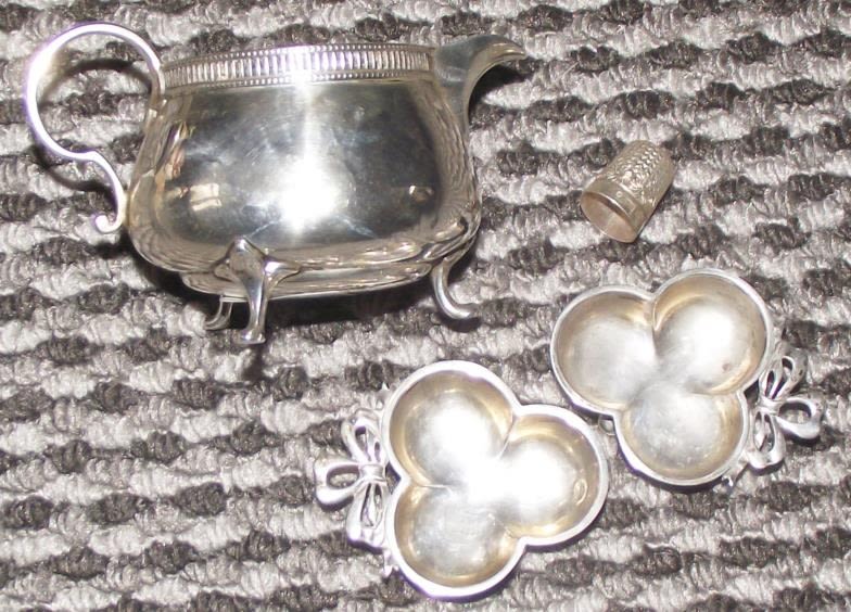 James Fenton 1905 silver thimble + pair of unusual silver salts by john millward banks Birmingham 1893