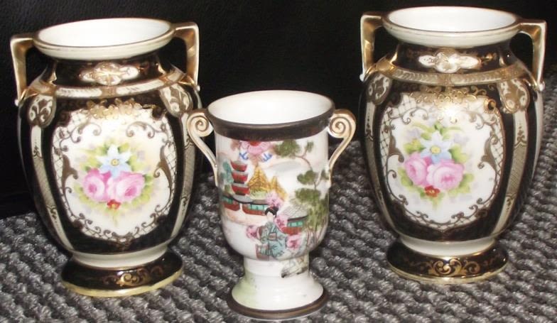 in gilded cartouches + small 4” high Noritaki Japanese pattern twin scroll handled bud vase