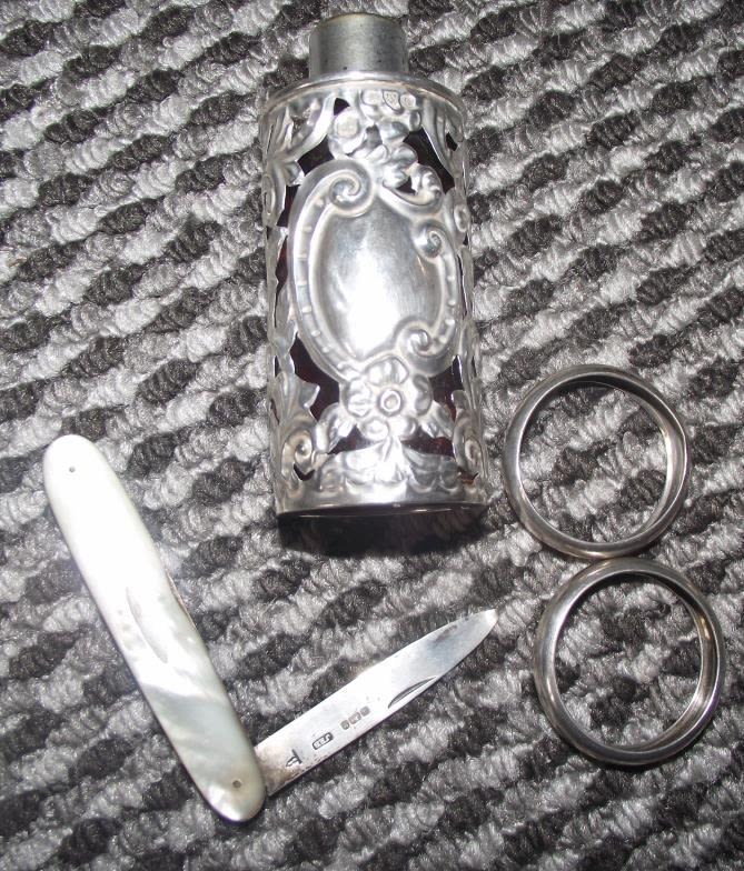 open ) + pair of silver napkin rings + silver scent bottle holder