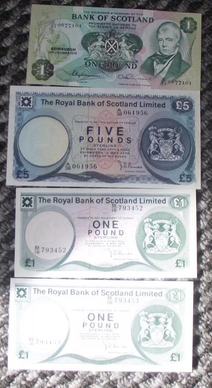 1975 royal bank of Scotland £5 note ( good condition slight centre crease)+ Bank of Scotland £1 note