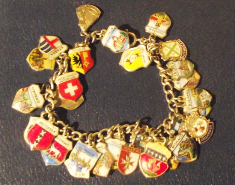 Silver bracelet with numerous enamel shields depicting different countries 40g approx.