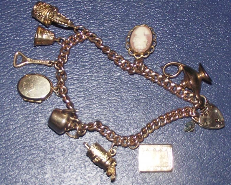 9ct gold padlock charm bracelet, holy bible, honey bee, cameo charms etc. 26g approx.
