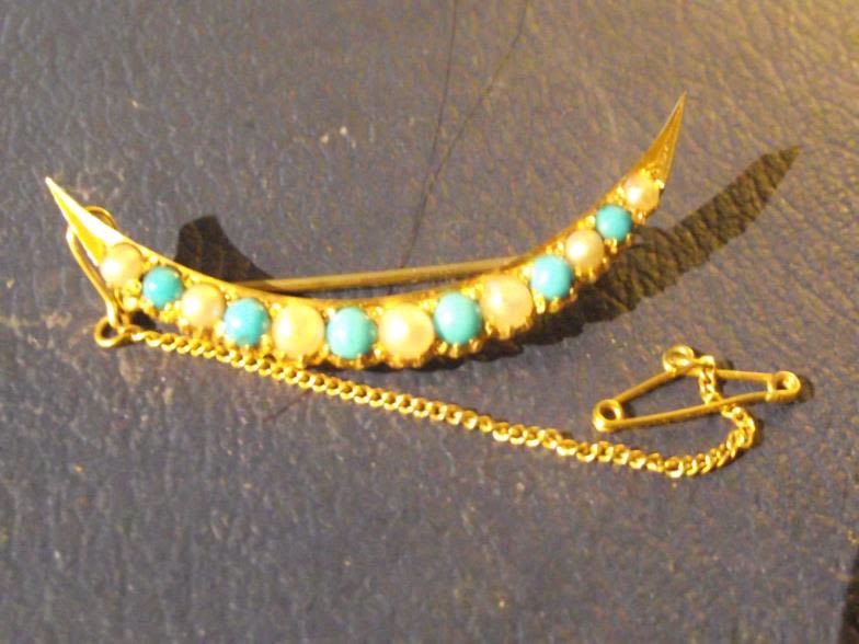 Art deco crescent moon pearl and turquoise set pin brooch with safety chain. unmarked tested as 18ct