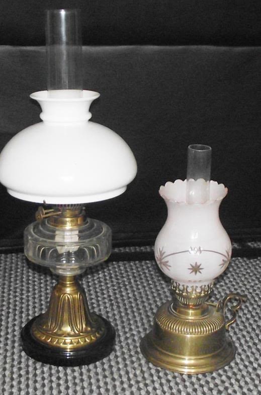 Victorian clear glass oil lamp with funnel and shade + 1 other later Edwardian oil lamp with funnel