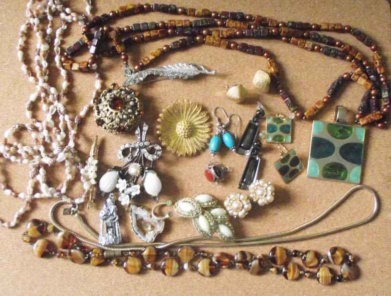 white metal revolving hardstone fob, Sara Coventry rope necklace etc.