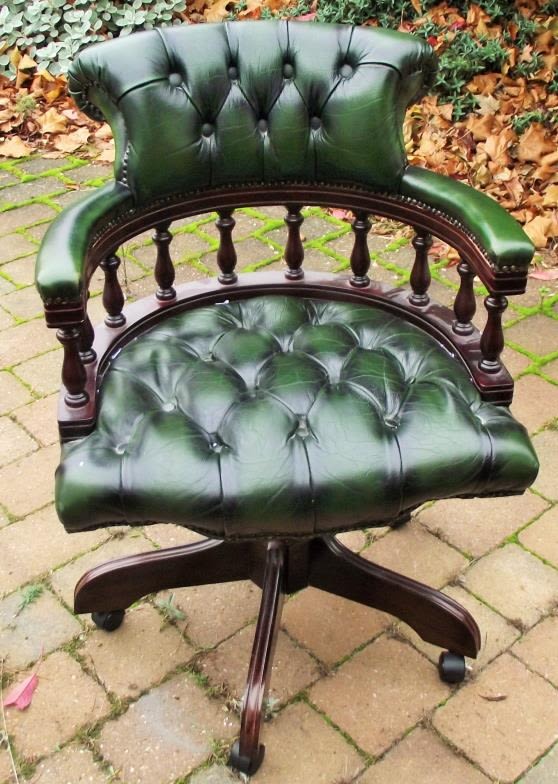 Vintage Chesterfield fully buttoned green leather captains style chair