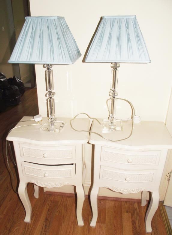 Pair of white painted bedside cabinets with a matching pair of glass bodied bedside lamps
