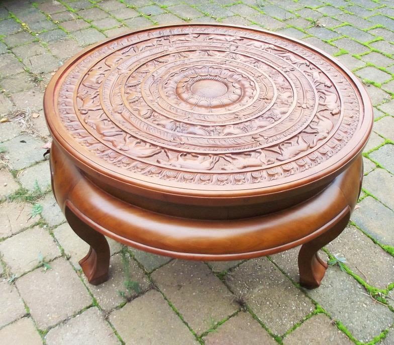 Indian style heavily carved top circular coffee table 30” diameter approx.
