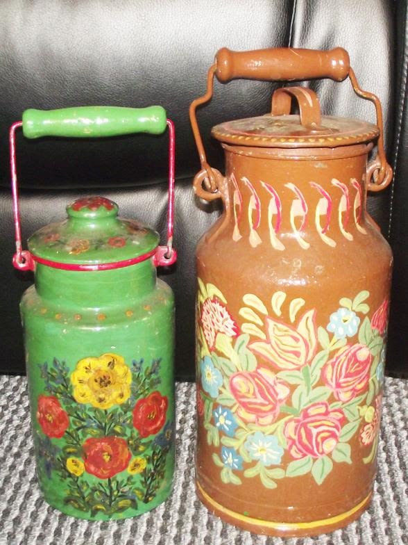 2 x hand painted barge ware small lidded milk churns both decorated with flower decoration both with