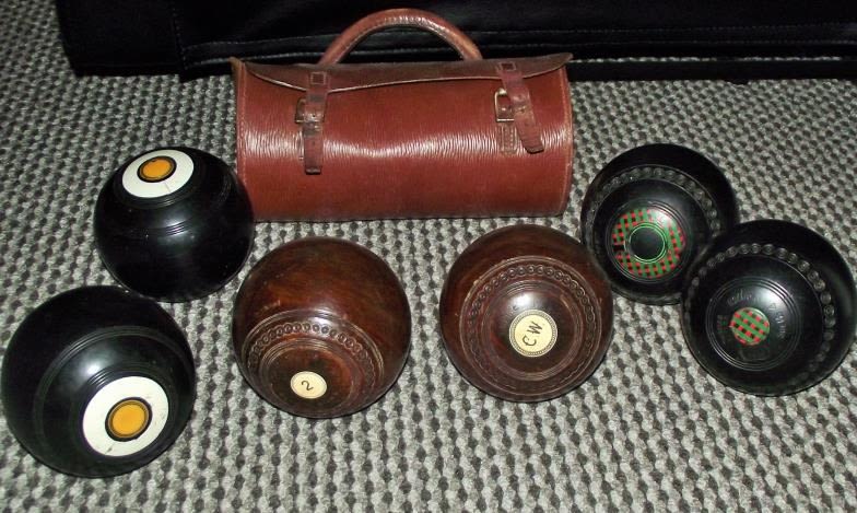 Selection of crown green bowling balls including 2 Taylor Rolph 1930s lignum bowls no1&2