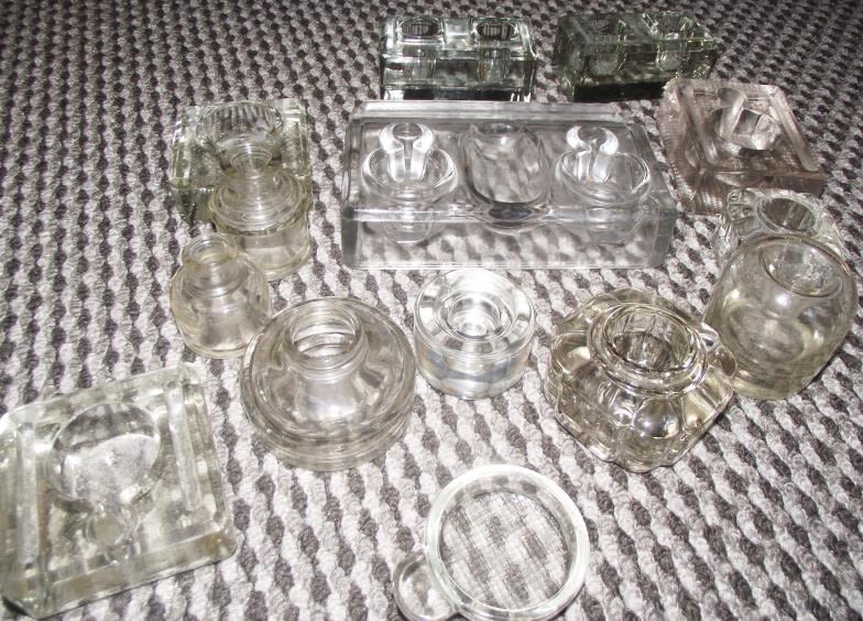 Collection of 14 vintage clear glass inkwells/ pen stands