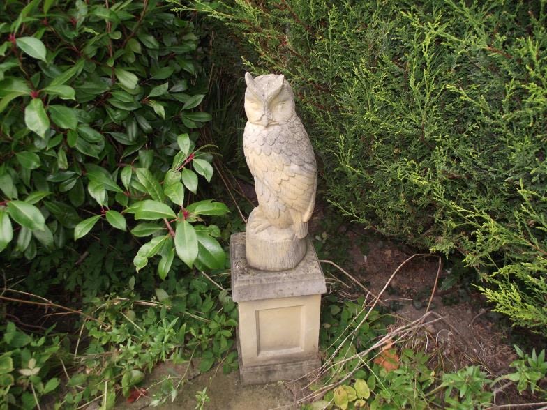 Heavy Reconstituted sandstone owl raised on a plinth garden ornament with good Verdigris patinatio