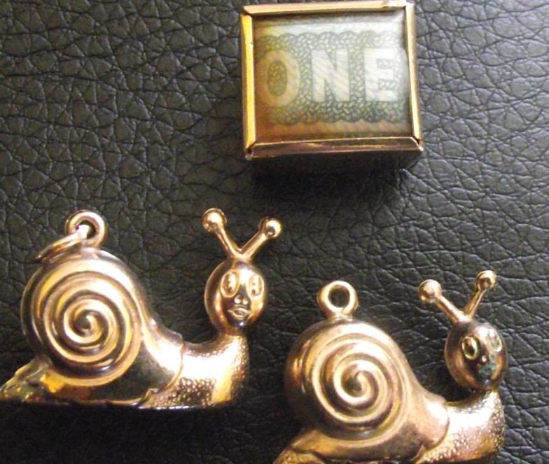 2 x unusual 9ct gold snail shaped charms + 9ct gold sealed one pound square charm 5.6g approx.
