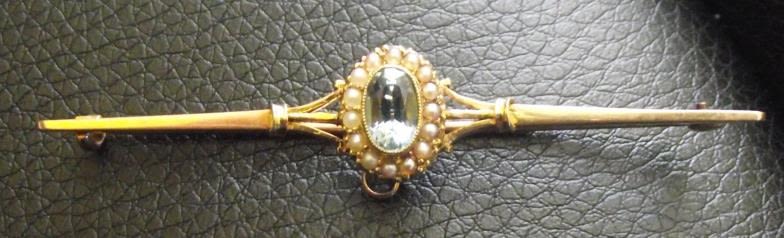 Quality Edwardian 15ct gold topaz and pearl bar brooch 3.8g