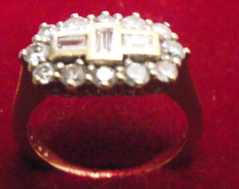Superb quality 18ct gold & Diamond thick shank set ring. Set with 3 baguette cut diamonds and 12 round