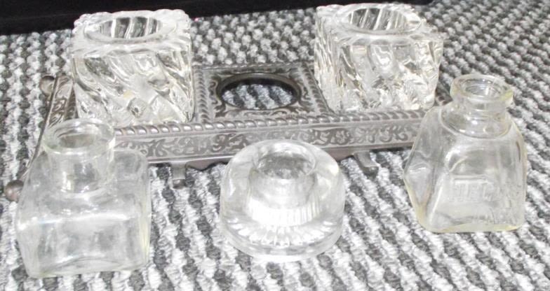 3 x vintage glass inkwells including one marked Fields ink + pair inkwells mounted on metal pen st