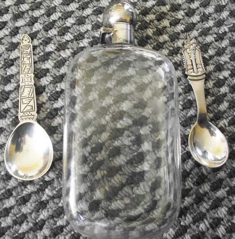 Silver topped glass bodied hip flask 1913 + 2x silver caddy spoons ( believed to be Norwegian)