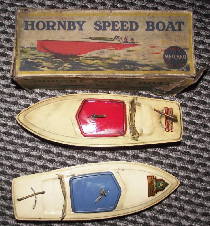 2x rare 1937 Hornby Coronation tin plate clockwork speed boats. Both with distressed boxes. Both working
