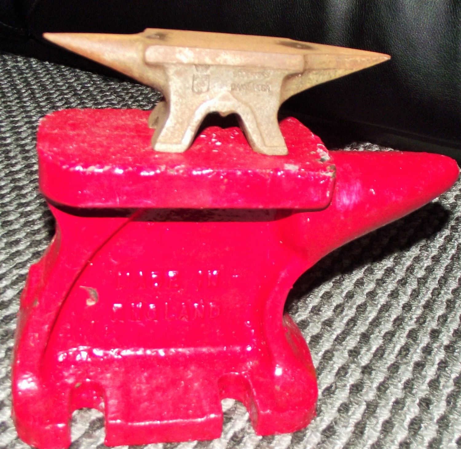 Red painted Record no11 single spur anvil + Small antique Sodafors Dannemoba 2 spur jewellers anvil .