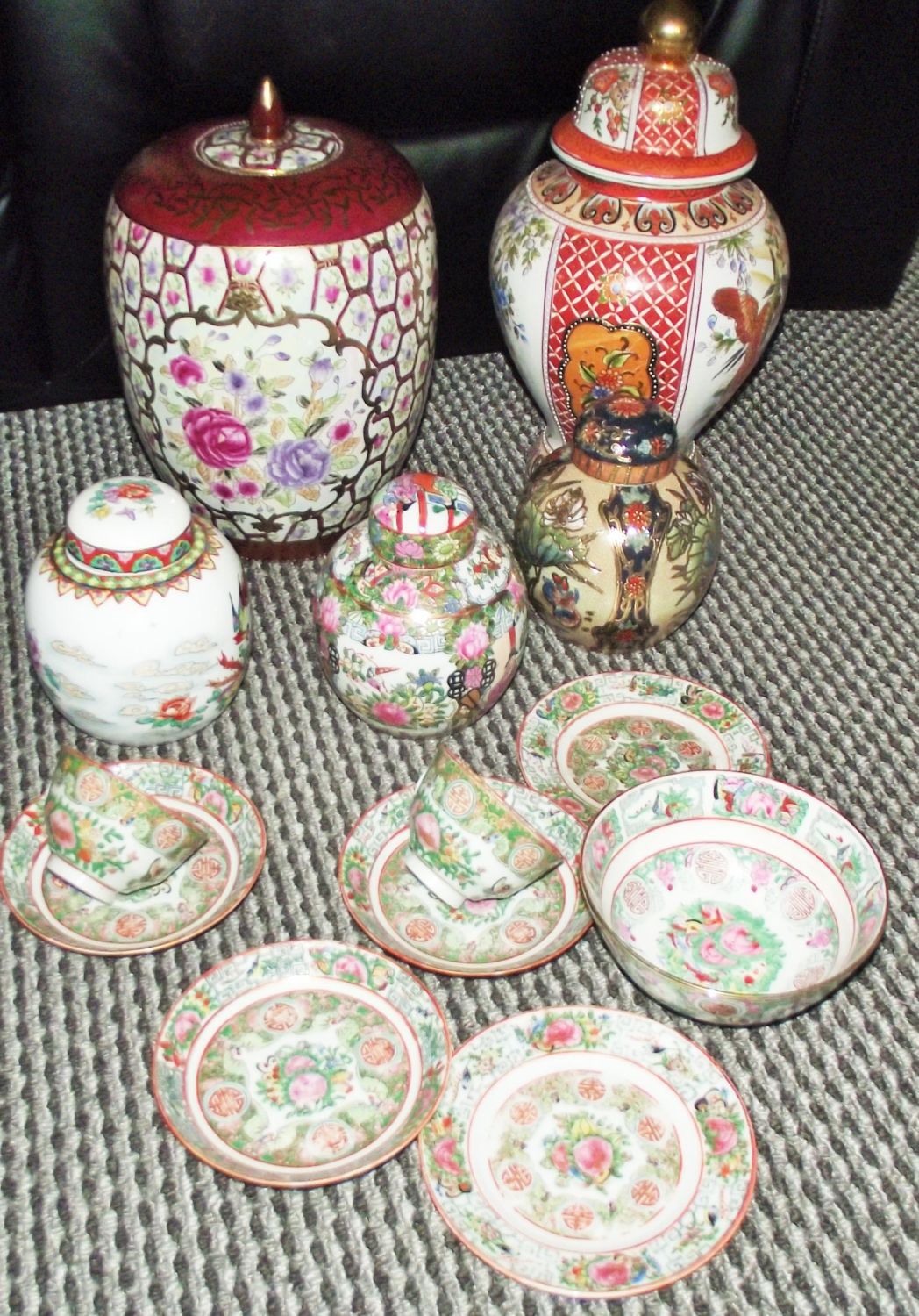 Selection of oriental/ Asian pottery including small & large ginger jars , bowl ,saucers ,cups etc (13) largest jar 14 approx.