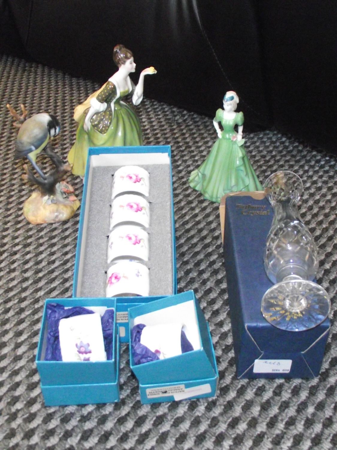 6 Coalport Napkins boxed + Tutbury crystal stem vase, Royal crown Derby blue tit model , coal port figurine Stella , Royal Doulton figurine Fleur