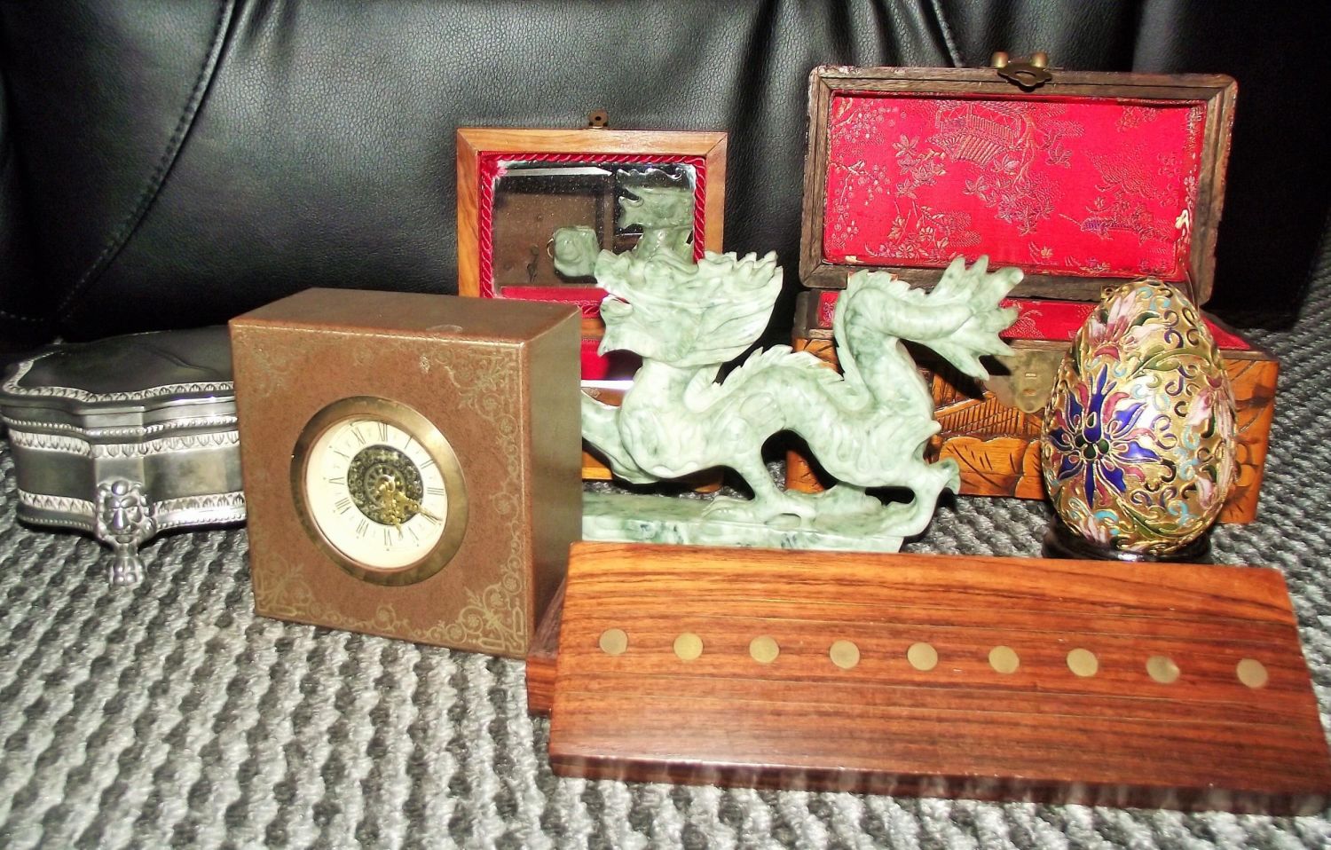Mixed lot inc. Oriental style carved box + Cloisonné style egg on stand +Swedish clock cased in leather with gilded detail ( working) + jade coloured dragon figure etc