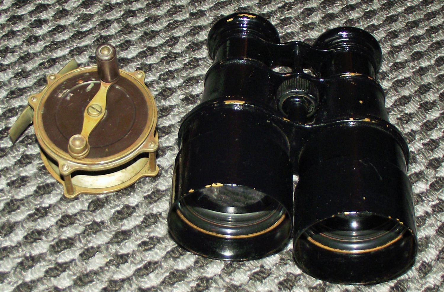 Pair of brass pre WW11 field glasses with extending lens sun shades+ vintage Amalia fly fishing reel with Bakelite fittings