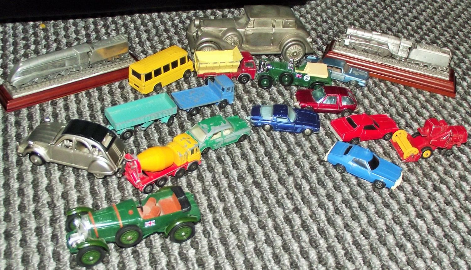 Collection of Lesney, corgi junior, Matchbox etc toy vehicles + 2x Royal Hampshire fine art miniature cast train models etc .