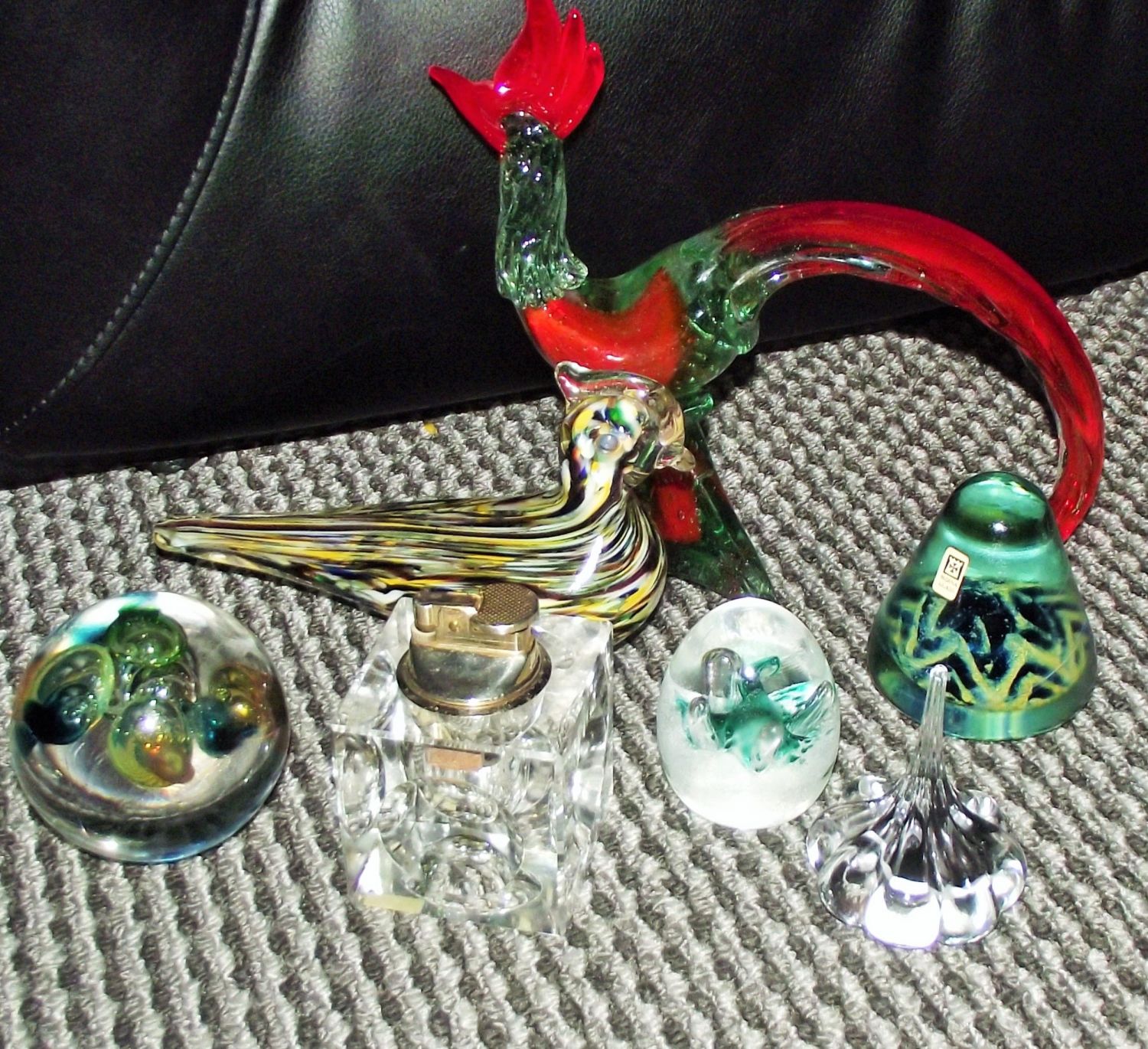 Selection of vintage glass paperweights inc Madina,Caithness+ vintage Venetian Glass company cockerel original label underside + Vintage hand blown Murano pheasant + vintage / retro 1950s clear glass cube table lighter ( working)