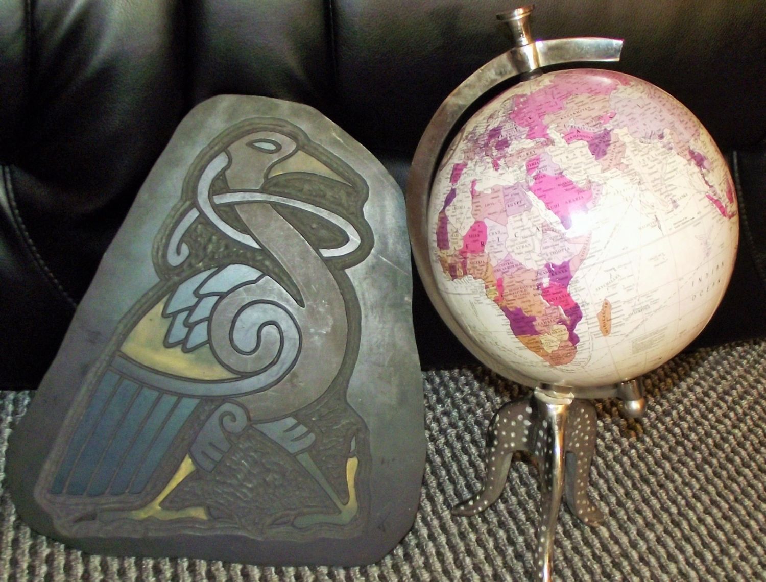 World globe raised on trefoil alloy legs + Keltic slate carving by Reg Beach .