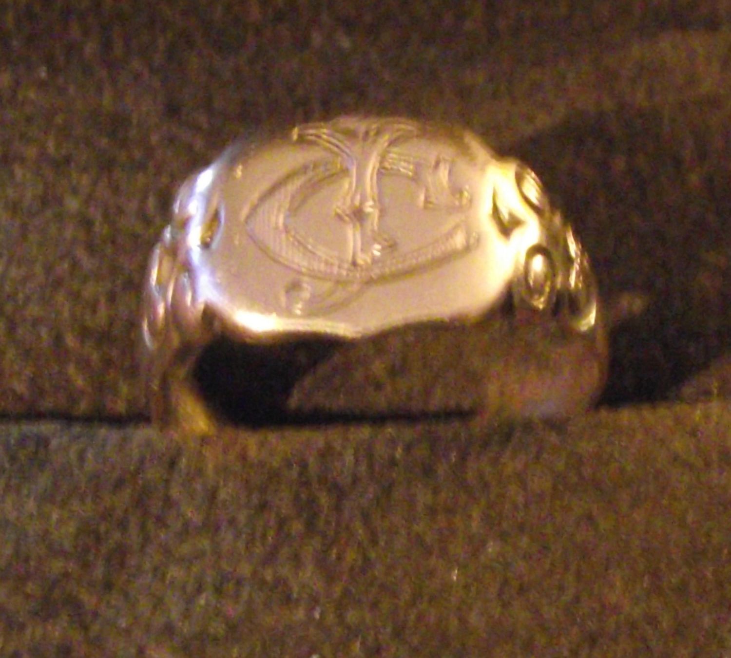 Gents 9ct gold hallmarked signet ring with detailed scroll sides and engraved CJ size U 4.4g approx.