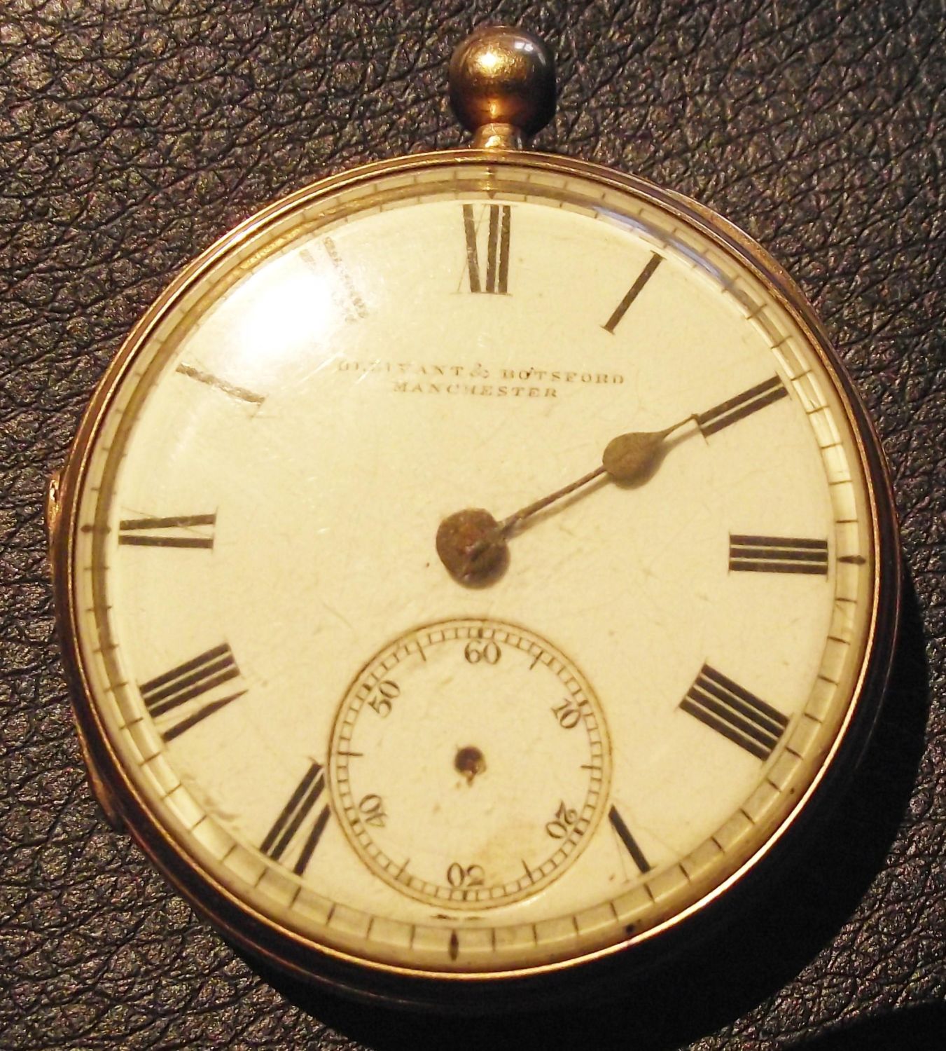Rare 18ct gold fully marked 45mm open face key wind pocket watch roman numerals Face signed Ollivant & Botsford Manchester (ticking when wound , missing minute finger and seconds finger also circular carrying loop dated london1875
