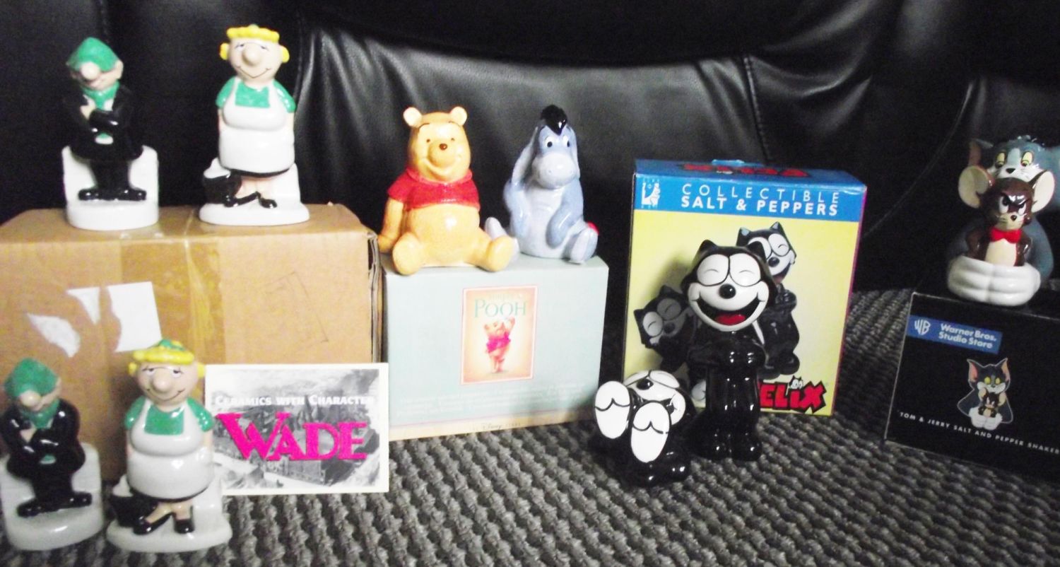 5x pairs of vintage cartoon character salt & pepper shakers inc Tom & Jerry Warner bros store , Felix the cat , Pooh bear & Eeyore,& 2 sets of WADE Andy cap & flo salt & peppershakers