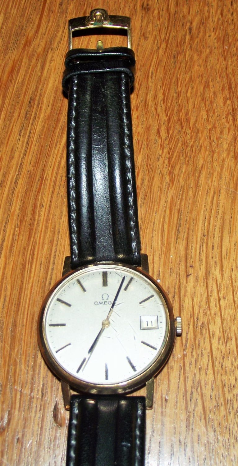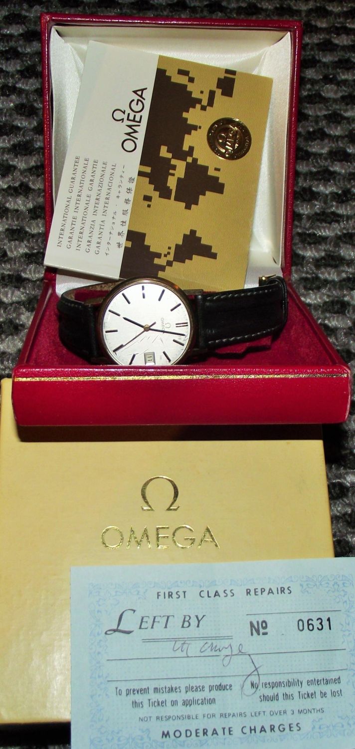 9CT yellow gold Omega 1977 presentation wrist watch (inscribed from kennings motor group) , unusual to feature a date aperture to grey dial with numeral batons, fitted with a black leather strap and plated clasp. working with box & paperwork. Slight scratches to glass