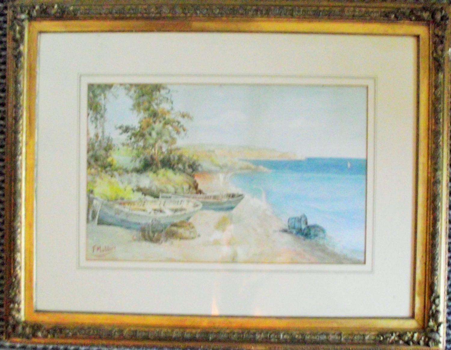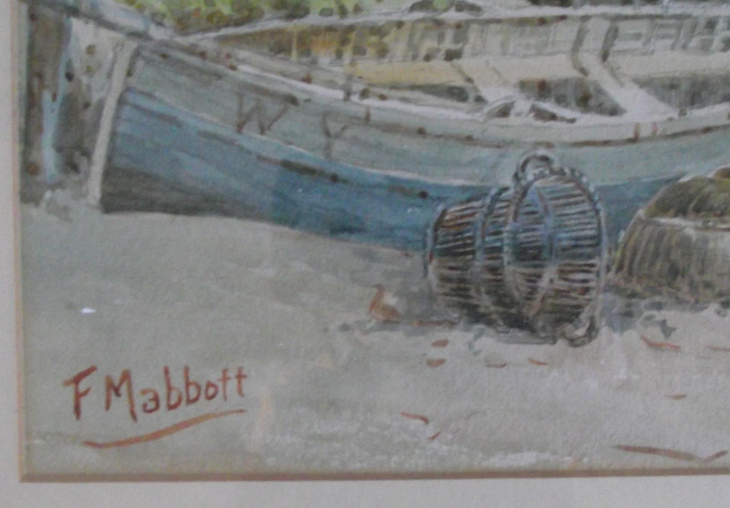 Quality 19thc water colour Lobster boats ashore signed F Mabbot 23×30 framed