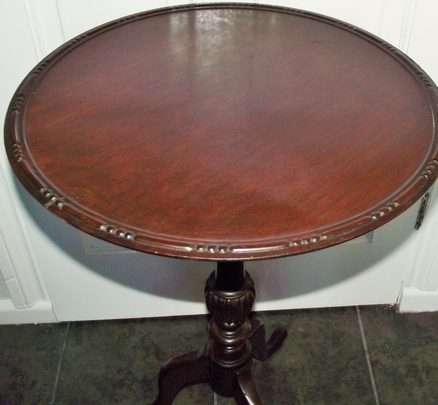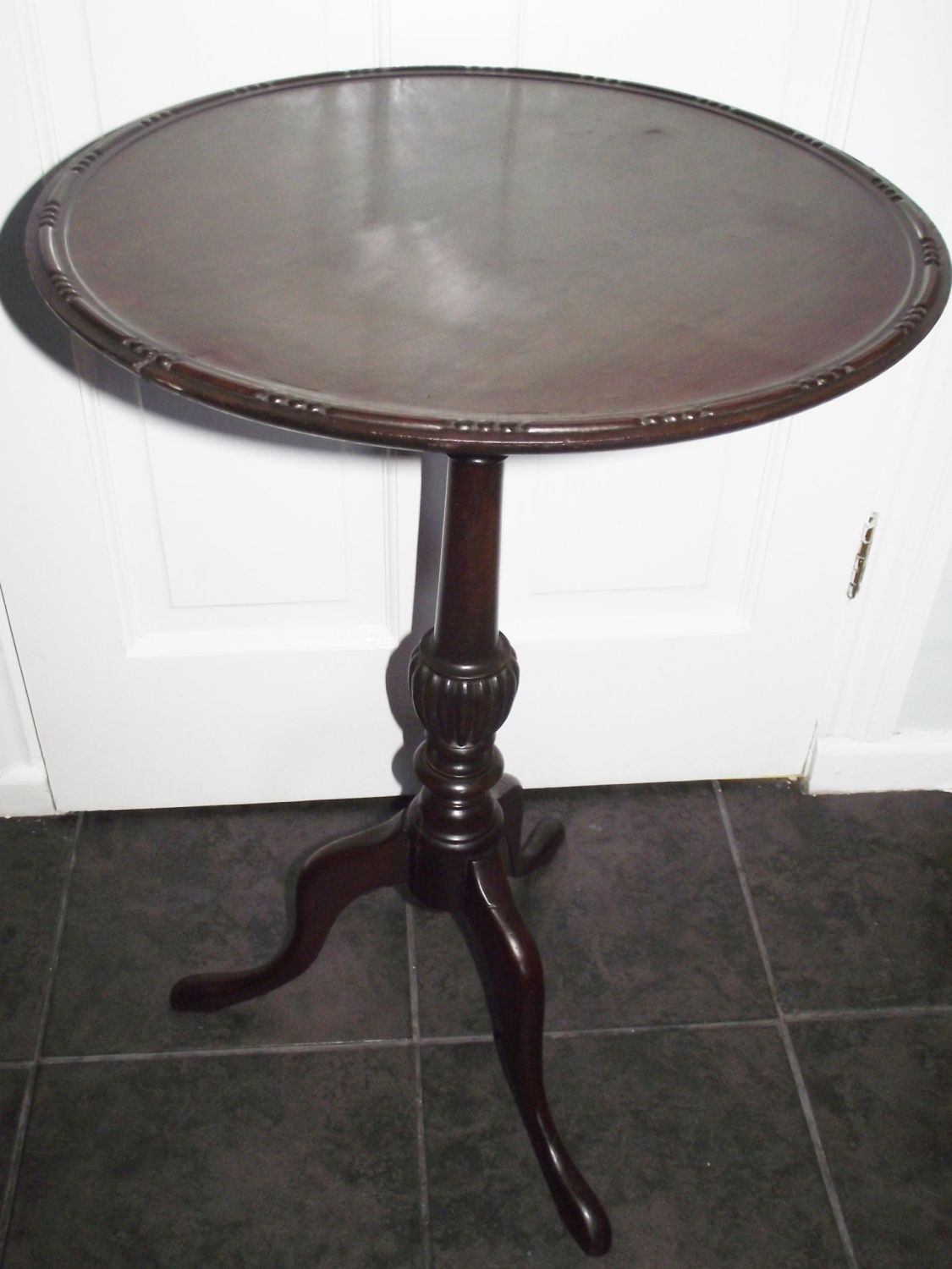 Antique single turned pedestal mahogany round topped wine table raised on 3 splay legs