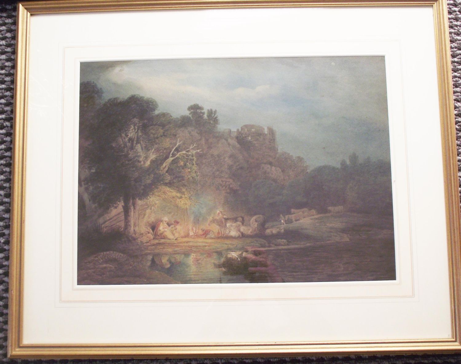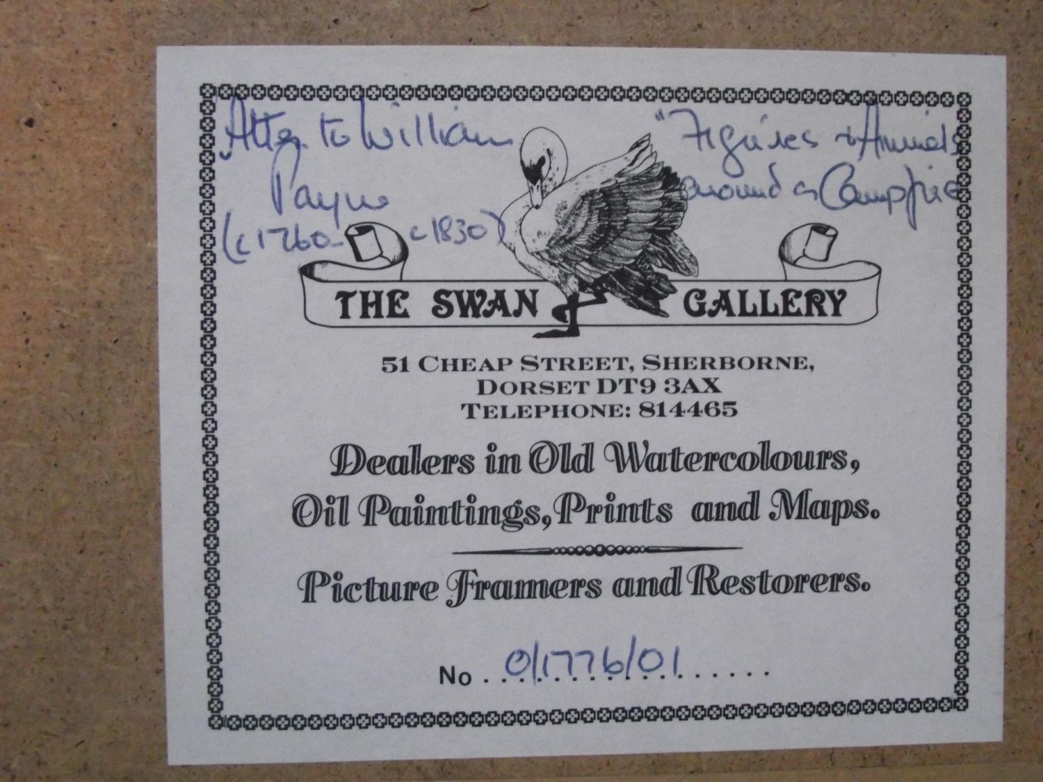 Superb English school 19thc watercolour attributed to William Payne 1760/1830 (Figures around a campfire) Payne exhibited works in both oil and watercolour: he showed work at the British Institution, and was elected as an associate of the Society of Painters in Water Colours. Swan Galleries attributory label to reverse 22×26.5 approx.