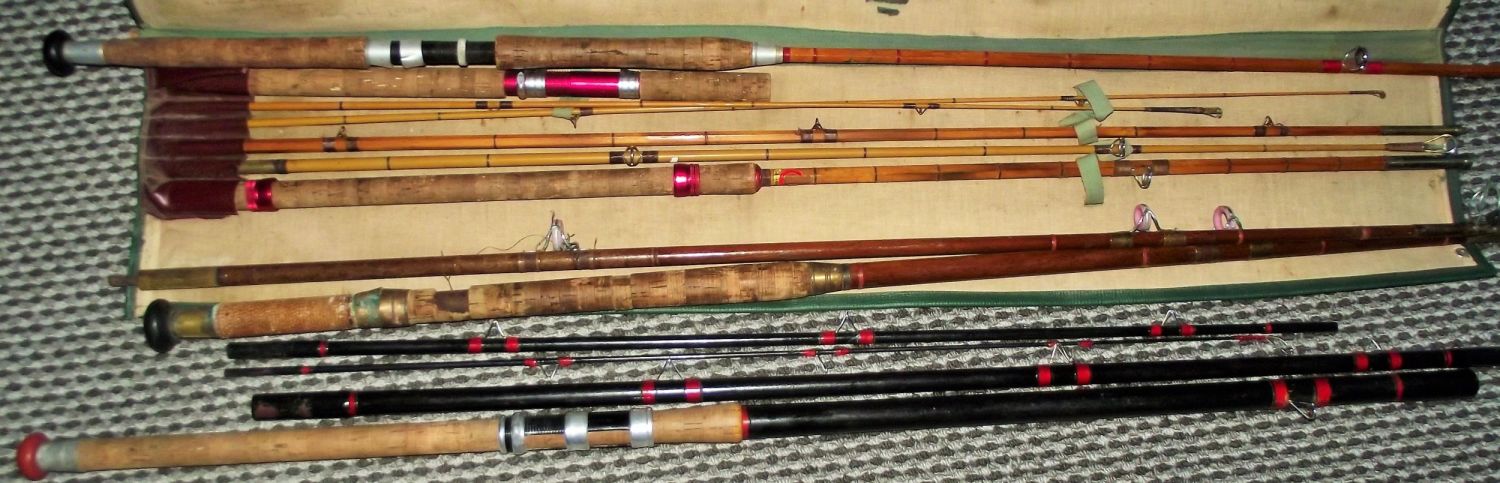 Collection of vintage cane Fishing rods with different tips + modern fishing rod all in carry bags