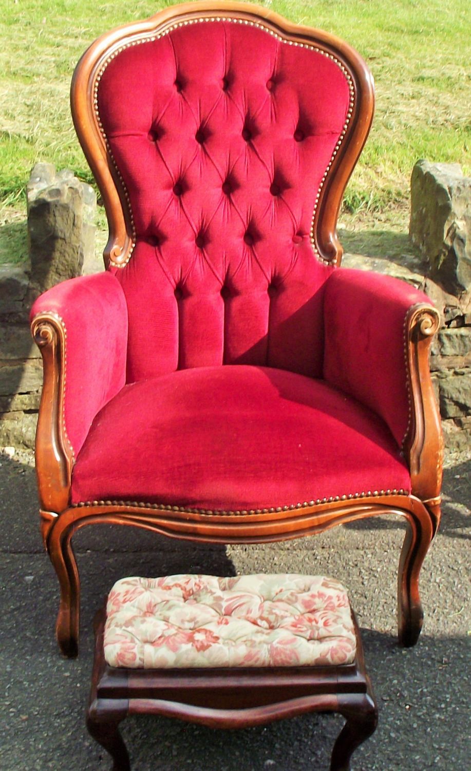 Ladies high backed red velvet button back arm chair + mahogany foot stool