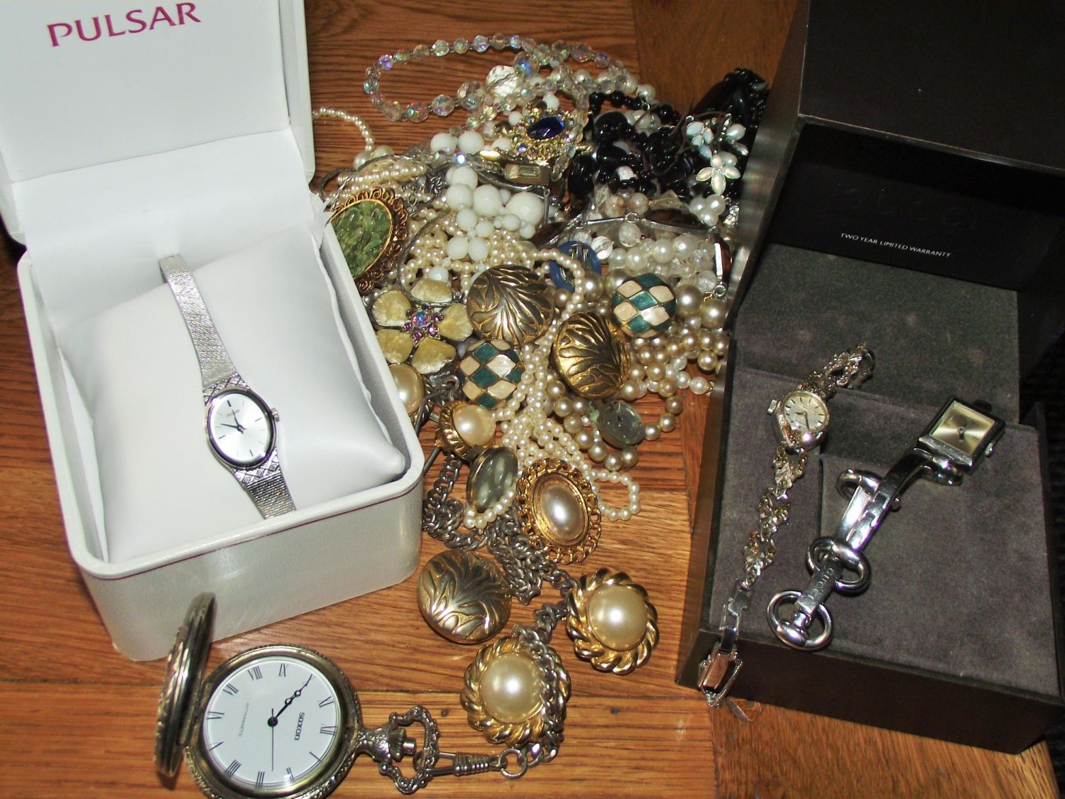 Nice parcel of Costume jewellery Inc. earrings pearls necklaces pulsar ladies watch Gucci stainless steel watch ( pin missing from strap original box ) Saxon ladies pocket watch, brooches, Ventora cocktail watch etc.